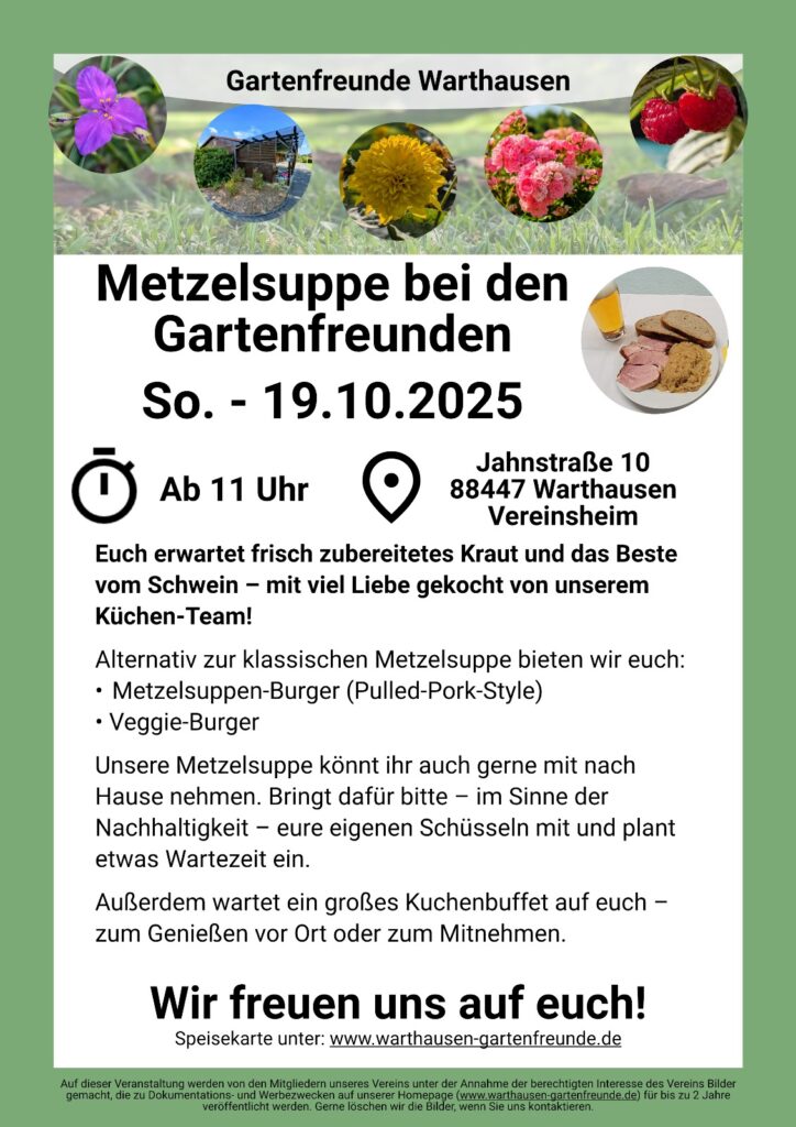 Auch dieses Jahr findet wieder die traditionelle Metzelsuppe der Gartenfreunde Warthausen statt!